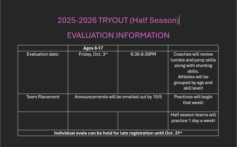 Don't forget to bring your completed forms to tryouts/assessments